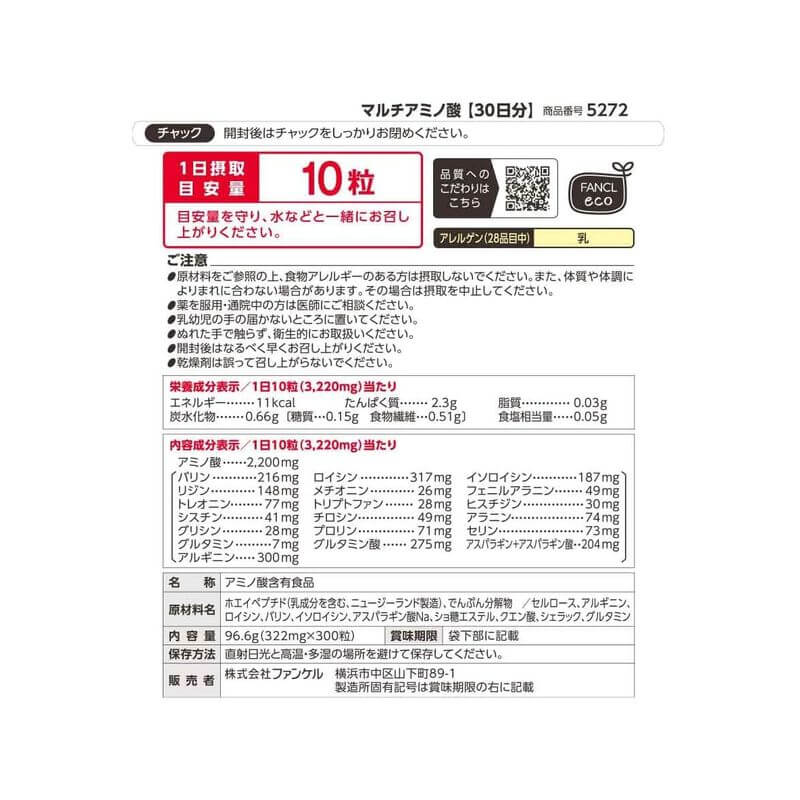 • Key Ingredients (per 10 tablets): Amino acids 2,200mg [Valine 216mg, Leucine 317mg, Isoleucine 187mg, Lysine 148mg, Methionine 26mg, Phenylalanine 49mg, Threonine 77mg, Tryptophan 28mg, Histidine 30mg, Cystine 41mg, Tyrosine 49mg, Arginine 300mg, Alanine 74mg, Aspartic Acid 200mg, Glutamic Acid 275mg, Glycine 28mg, Proline 71mg, Serine 73mg, Glutamine 7mg, Asparagine 4mg]