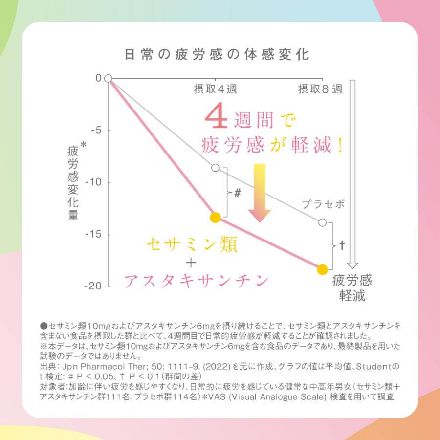 Formulated with potent antioxidants "Sesamin Compounds" and "Astaxanthin," this supplement helps middle-aged and older adults alleviate age-related occasional fatigue while promoting overall vitality and well-being.