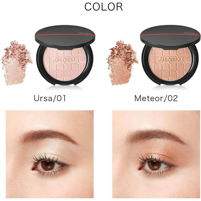 • Super-fine glowing pearls, pressed with a liquid-in formula, provide a dewy and radiant shine