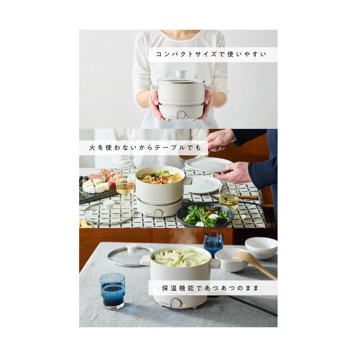 • Electric heating design allows safe cooking without fire and includes a keep-warm function