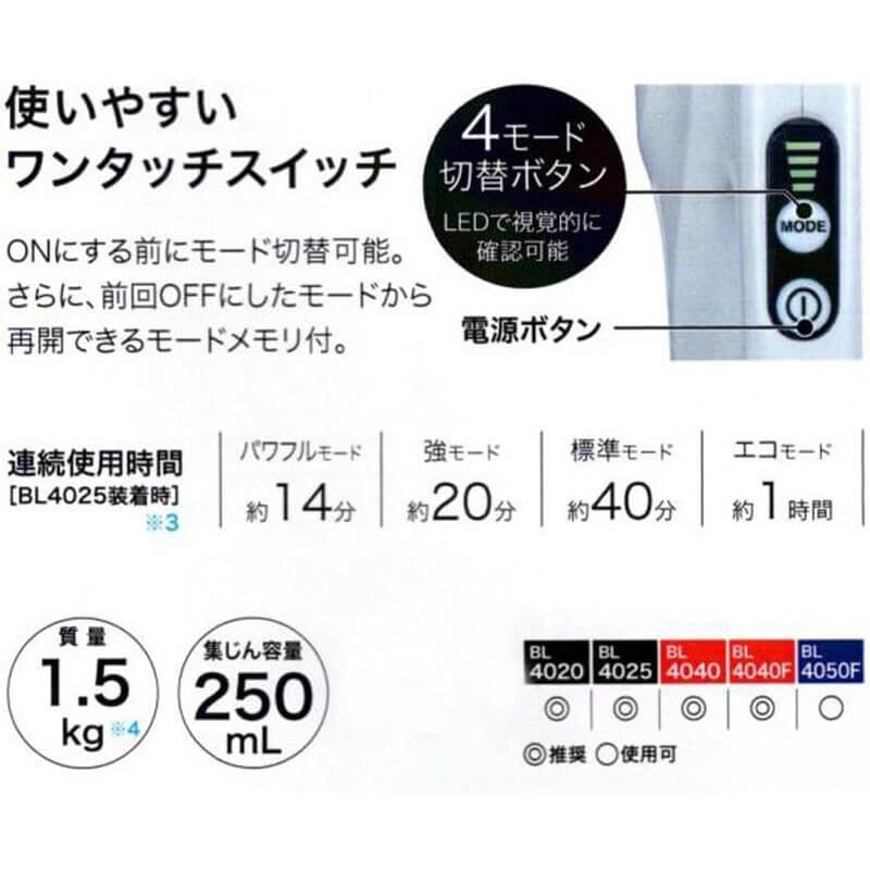 • Runtime (per charge): Power ~14 min / Strong ~20 min / Standard ~40 min / Eco ~60 min