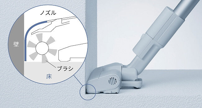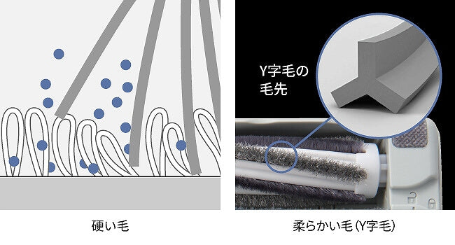 Dual-brush system (hard bristles and Y-shaped soft bristles) for deep-cleaning carpets, hardwood floors, and tatami mats.