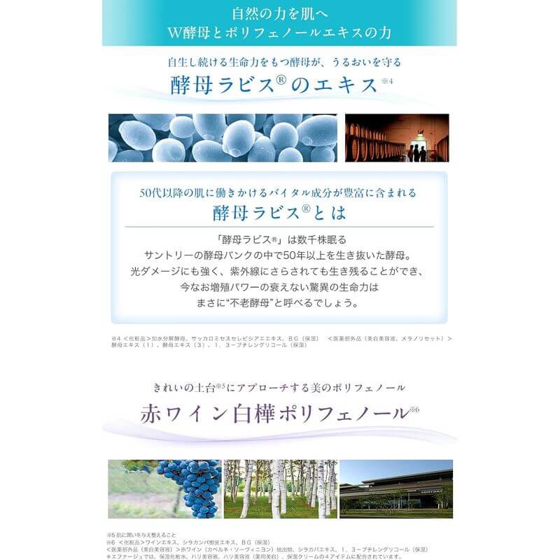 • Other ingredients: Prune enzyme decomposition extract, Edelweiss extract, DL-α-tocopheryl acetate, Pyracantha extract, Lotus seed lactic fermentation liquid, Hydrolyzed conchiolin liquid, Red wine (Cabernet Sauvignon) extract, Alpinia katsumadai seed extract, Yeast extract (1)(3), Purified water, 1,3-butylene glycol, Ethanol, Triethanolamine, Acrylic/Methacrylic copolymer, Xanthan gum, Surfactants, Glycerin, Disodium EDTA, Dipropylene glycol, Concentrated glycerin, Orange oil, Sodium pyrophosphate, EDTA, Citric acid, Paraben, Phenoxyethanol (listed in the original order)