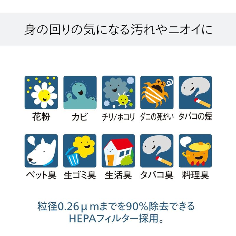 • Equipped with high-performance HEPA filter that removes 90% of particles down to 0.26μm