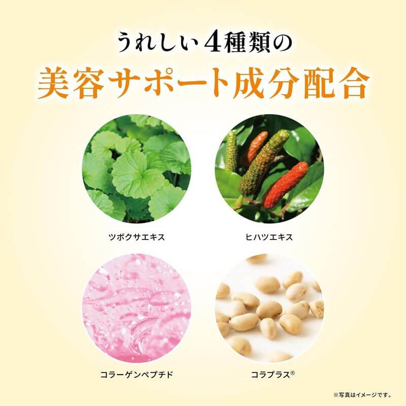 • 成分:膠原蛋白胜肽(含明膠)、麥芽糖醇、橙汁、糊精、大豆胜肽、加工油脂、薑黃萃取、積雪草萃取、胡椒萃取/維生素C、HPMC、甜味劑(阿斯巴甜、L-苯丙氨酸化合物)、加工澱粉、菸鹼酸、葵花卵磷脂、維生素B1、香料、維生素B6、維生素B2