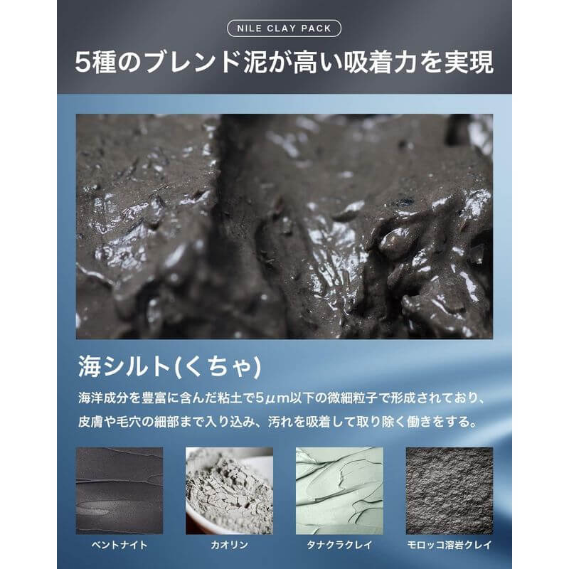 • 採用4種天然礦物泥成分(高嶺土、膨潤土、田倉泥、摩洛哥熔岩泥),深入吸附毛孔污垢與老廢角質