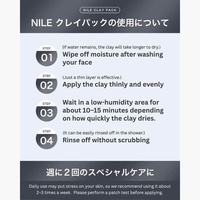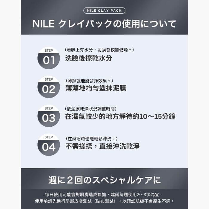 • 使用方法:於洗臉後,輕拍乾肌後均勻塗抹於毛孔及膚況較粗糙處(如鼻頭、額頭、下巴),靜待約10分鐘至泥膜表面乾燥後,用溫水(約36~40度)輕柔洗淨。建議每週使用1~2次