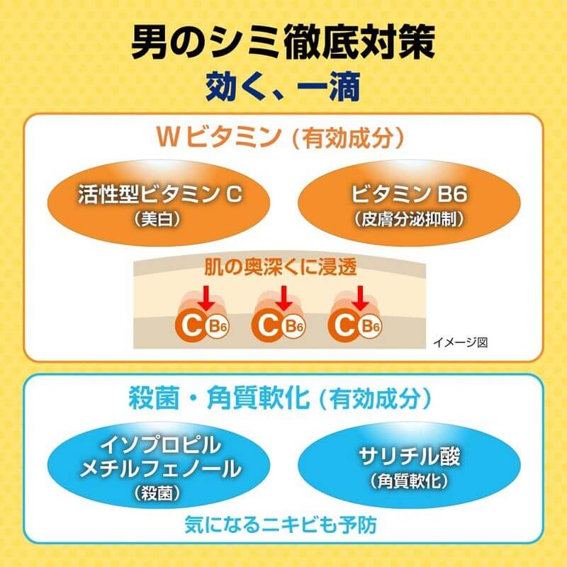 • 主要成分:抗壞血酸(活性型維他命C)、鹽酸吡哆醇(維他命B6)、水楊酸、異丙基甲基苯酚、Alpinia White